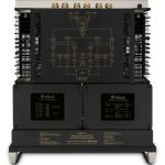 The front panel features new direct LED backlighting for improved appearance and color accuracy. On top, the audio Autoformer and power transformer remain seated just behind the front panel, but are now contained in new glass topped enclosures. Behind them are 2 of our Monogrammed Heatsinks™ which connect to advanced high current output transistors that help eliminate thermal equilibrium lag time. A screening of the amplifier’s block diagram has been added to the panel located between the heatsinks.