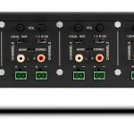 On the front panel, multi-color LED indicators display the status of each channel. On the back are unbalanced inputs for each channel plus 2-pole Phoenix style push-in speaker terminals. Also located on the back are volume controls for volume balancing, along with 2 digital audio inputs (either coax or optical) that can be bussed, and channel summing circuits for easy mono signal distribution.